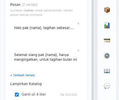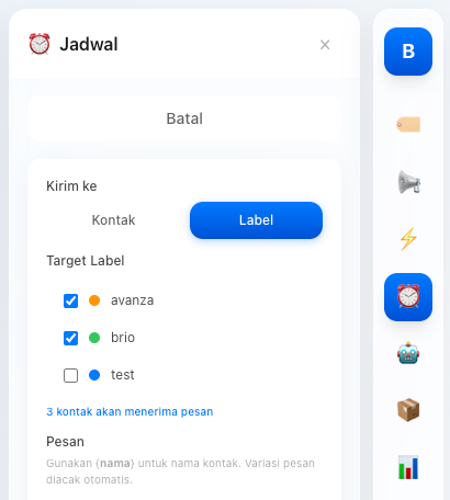 - Masukkan pesan. Bisa dengan variasi untuk pesan random. Gunakan {nama} yang akan dirubah menjadi nama di kontak